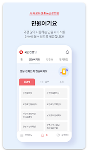 더 건강한 국민의 삶을 위해 모바일로 편리하게 민원서비스를 이용하세요. 1. 민원여기요 - 자격득실확인서, 보험료 납부확인서 등 증명서 5종을 제출기관에 팩스로 보낼 수 있습니다. - 보험