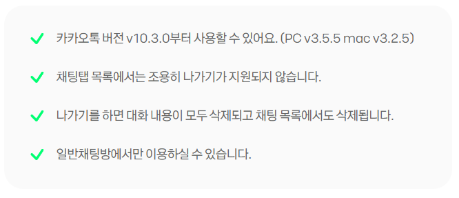 - 조용히 나가기 기능을 사용하면 채팅방에서 나가더라도 기존의 대화 내용은 계속 볼 수 있습니다.